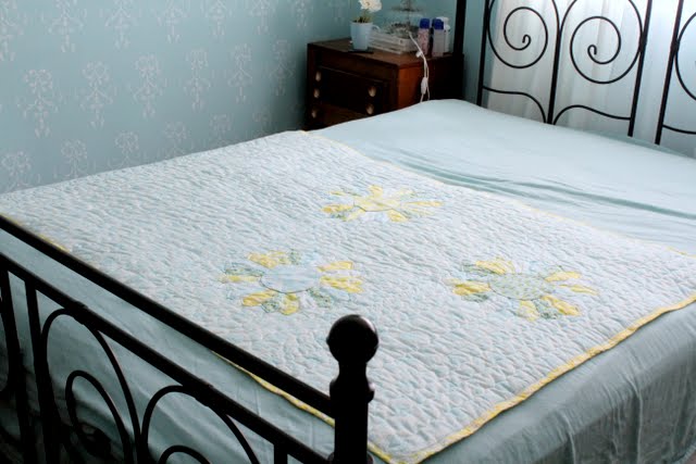 A little while ago I posted about a quilt that I was starting work on using this tutorial from a cuppa and a catch up. I loved how easy and fun the process looked. Unfortunately (or perhaps fortunately) when I began the quilt my sewing machine went kaput. I visited a locally owned sewing machine shop and fell madly in love with a very pricy but beautiful sewing machine. Before I knew it the machine (thankfully last years model so it was discounted) was on my kitchen table and ready to quilt. I still shudder thinking about the cost of the machine, however I try to see it as an investment for me and my family. I am a gal that loves to get her sew on. I made the quilt using various fabrics from my local Fabricland - nothing too fancy just nice quilters cotton. I also made the binding on the quilt (my first time ever doing this) - and I am sold on forever more making my own binding. The binding is soft (because it's made from the same cotton used in the quilt) - and it is much more homey looking then store bought. Sure making binding is labor intensive, however I think it's worth the results when you think about how much work you put into the quilt itself. As for what I learned during the making of this quilt? I really dislike sinthetic polyester batting or lining. I've only ever used cotton batting and this time I chose polyester. I can tell by feeling the quilt it just isn't the same - I also had problems with the batting shifting and morphing into weird shapes when I was quilting. Oh well lesson learned. On the back (or front, whichever way you look at it) of the quilt I made three Dresden Plate's using this tutorial from Sew, Mama, Sew! I've used that tutorial before for Dresden's and I really love the way the quilt blocks turn out.